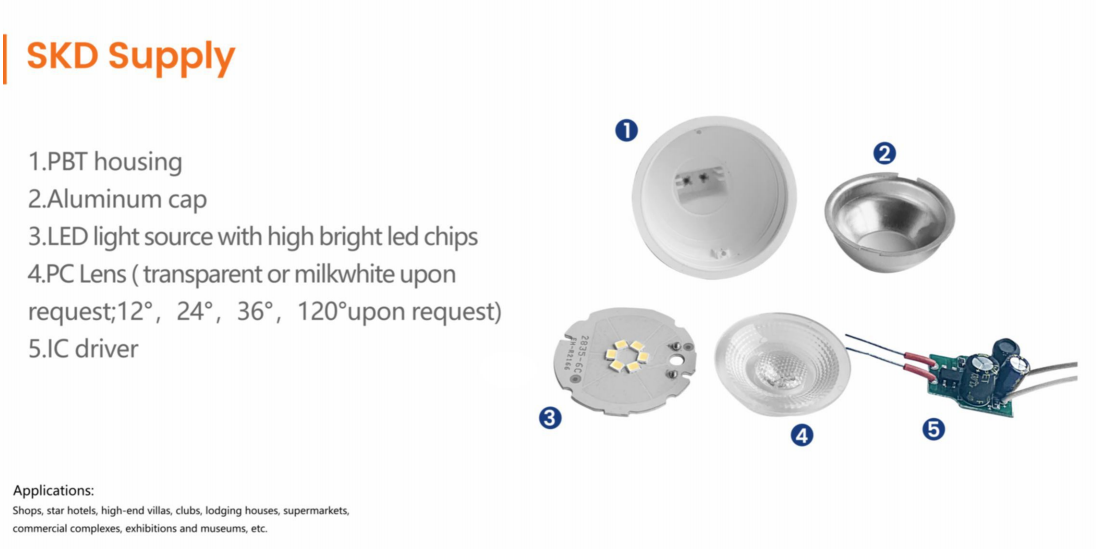 | ltem No. | Power(+5%) | Product Size | Lens | Material | CCT | LM/W(±5%) | Input Voltage | Driver |